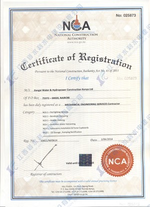 江西省水利水電建設有限公司肯尼亞分公司接到通告后,積極準備相關資料,憑借公司的技術實力和肯尼亞市場的良好業績,最終取得所有六項的一級證書。其中包括:水利施工一級,公路工程施工一級,房屋建筑工程施工一級,結構施工一級,電力工程施工一級和機電工程施工一級,有力地提升公司的品牌影響,提升了公司資信競爭力,為公司在肯尼亞各項工作的全面深入開展創造了積極有利的條件。
