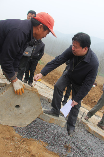 工程部副部長(zhǎng)劉滔檢查砼預(yù)制塊的厚度