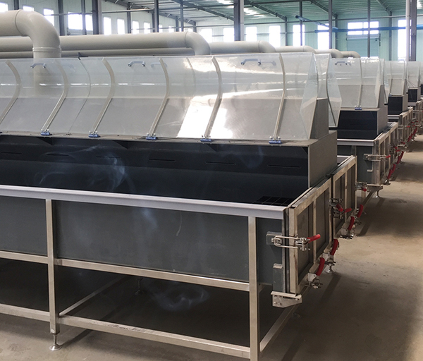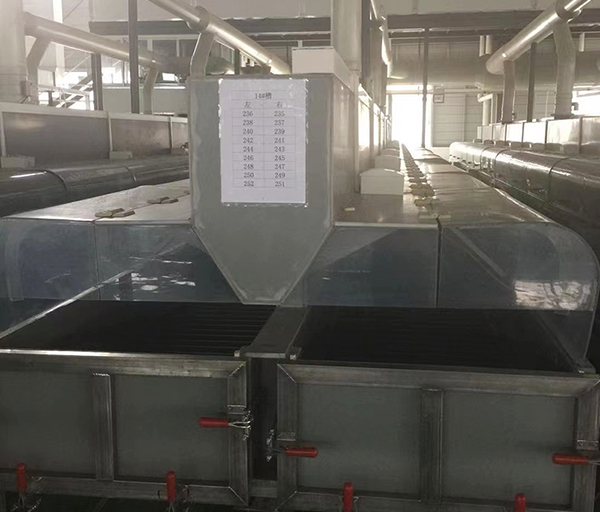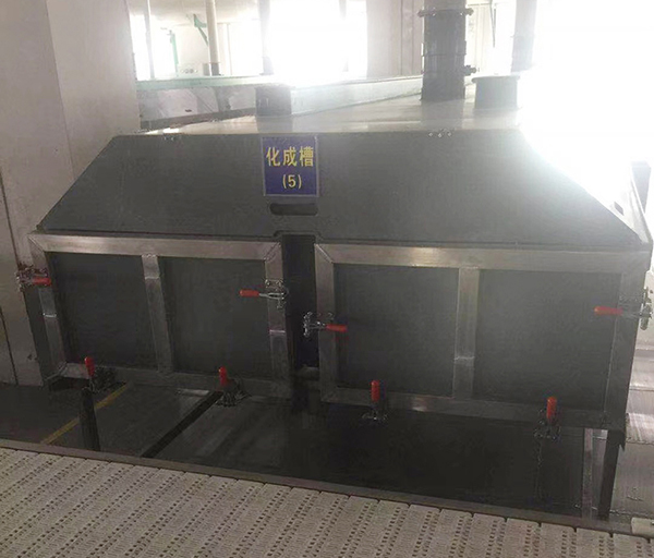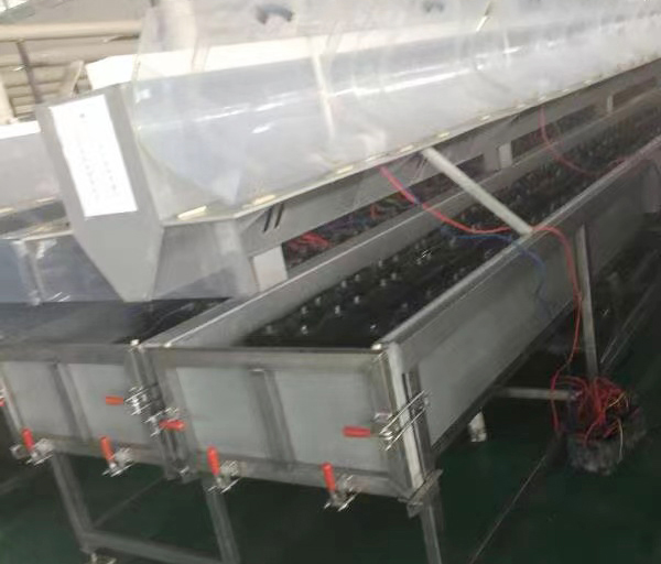 工藝簡介:電池加酸完畢后有自動輸送線輸送到指定化成線,由活動小車與指定化成線連接,化成線側門自動打開,電池按秩序進人化成線活動鏈板,并自動拉開電池與電池間的間隙,間隙的寬度可以自動調整。電池進入指定位置后,化成線側門自動關閉自動加入冷卻水至指定高度,汽缸自動打開化成線觀察門,由人工進行連接導線。連接完畢后自動關閉觀察門,循環冷卻水進行自動恒溫冷卻,抽風系統自動抽風,并帶出電池散發出的熱量,由室外凈化系統進行凈化排放。化成完畢后,門自動打開,由人工拆除連接導線,冷卻水排放至蓄水池電池由側門經活動小車進入電池下線系統輸送到電池收集區進行整理包裝。